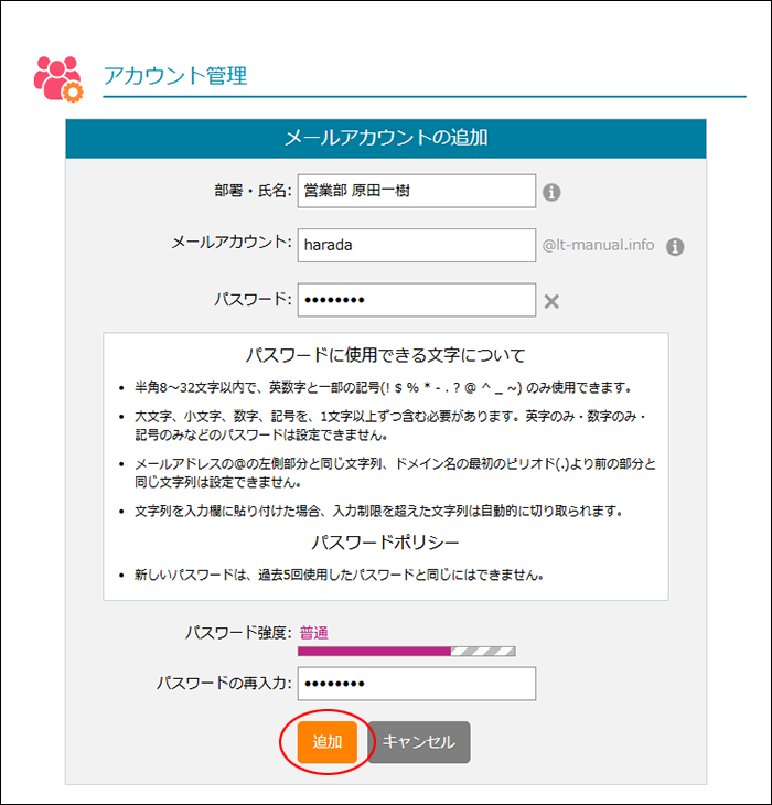 登録するメールアカウント数が多い場合は、アカウント一括登録画面でCSVファイルから一括登録することをお勧めします。