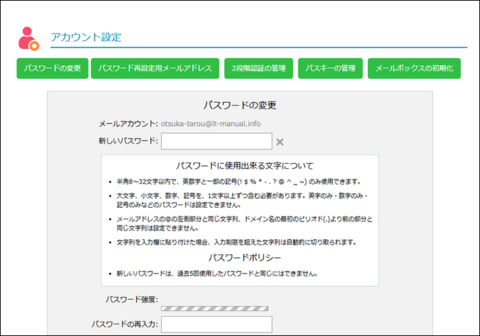パスワードの変更やメールボックス初期化の画面は、以下の方法で表示します。