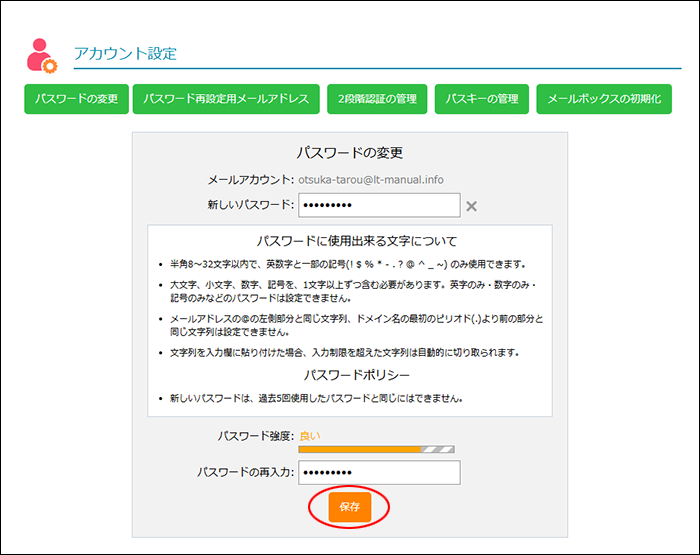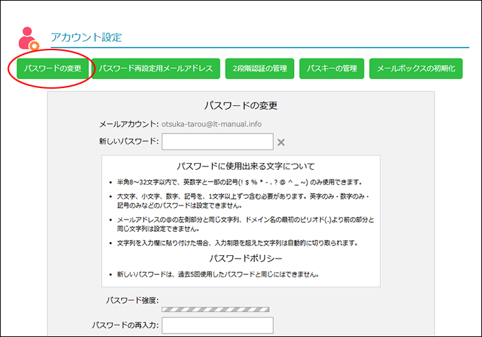| パスワードの再入力 | 再度、新しいパスワードを入力します。 |