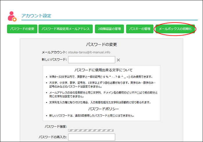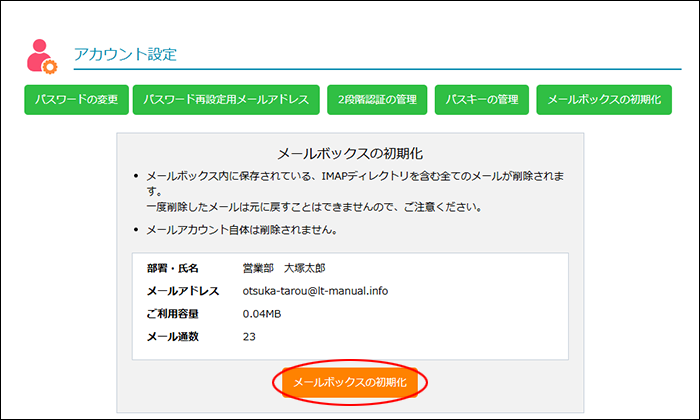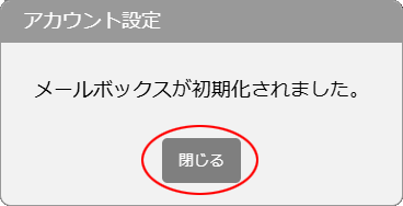 step 1 アカウント設定画面を表示し、「メールボックスの初期化」ボタンをクリックします。