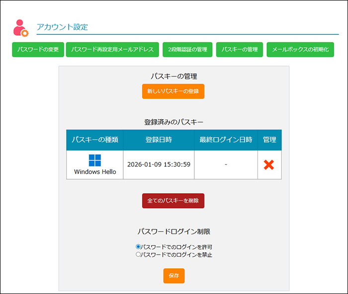 パスキーの管理画面が表示されます。