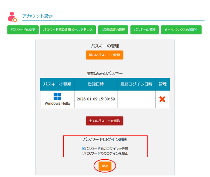 step2 「新しいパスキーの登録」ボタンをクリックします。