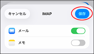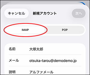 「IMAP」が選択されていることを確認します。選択されていない場合、「IMAP」をタップします。