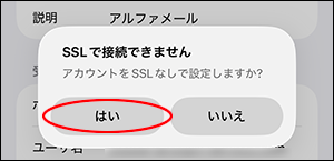 「SSLで接続できません」という画面が表示されましたら、「はい」をタップします。