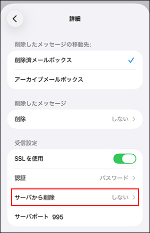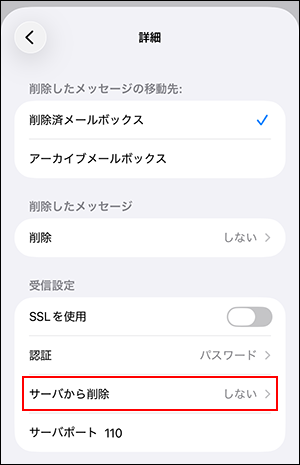 サーバから削除 iPhoneで受信したメールをパソコンでも受信される場合、「しない」を選択します。