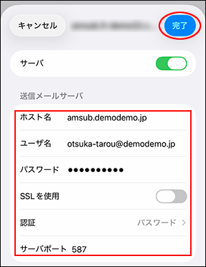 SSLを使用 「オフ」を選択 認証 「パスワード」を選択 サーバポート 「587」を入力 -
