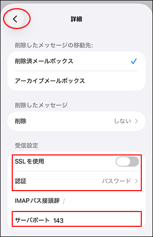 SSLを使用 「オフ」を選択 認証 「パスワード」を選択 サーバポート 「143」を入力 -
