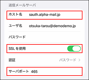 「ホスト名」に「sauth.alpha-mail.jp」と入力します。 「SSLを使用」で「オン」を選択し、「サーバポート」に「465」と入力します。