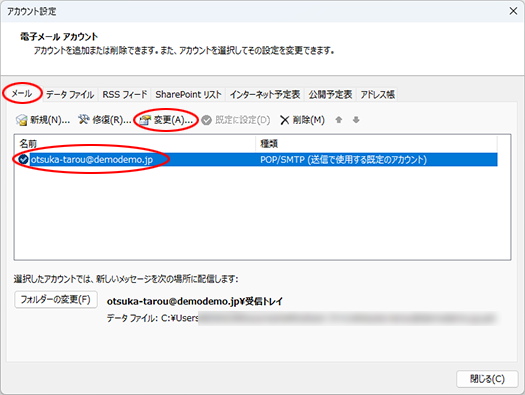 「メール」タブをクリックし、ご利用のアカウントを選択して「変更」ボタンをクリックします。
