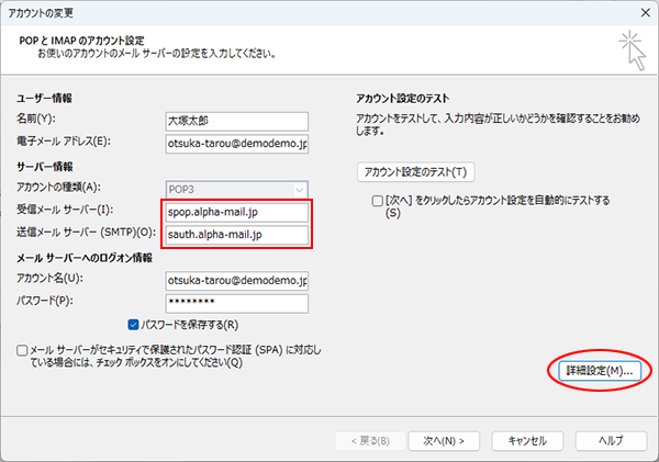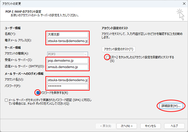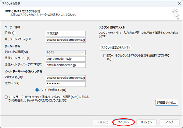 パスワードを保存する 保存する場合はチェックします。 [次へ]をクリックしたらアカウント設定を自動的にテストする チェックしません。 - ※経路暗号化の設定はこちらをご参照ください。