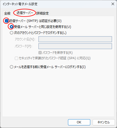 送信サーバー(SMTP)は認証が必要 チェックします。 受信メールサーバーと同じ設定を使用する 選択します。 -