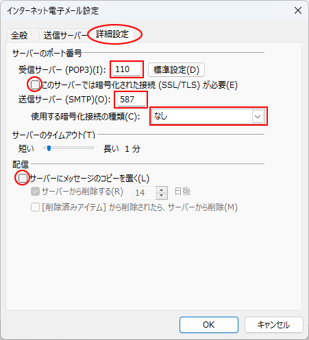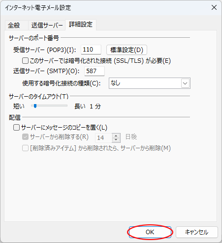 送信サーバー(SMTP) 「587」を入力し、「使用する暗号化接続の種類」で「なし」を選択します。 -