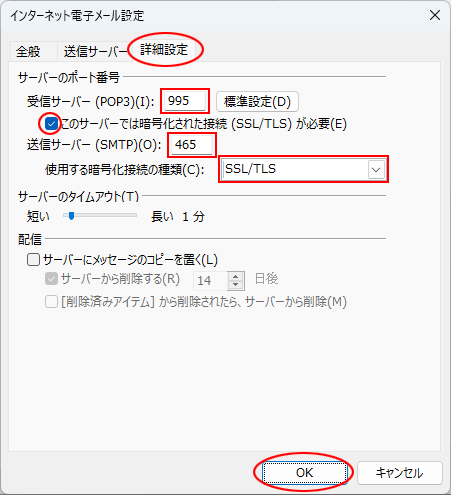(POP over SSL)「995」を入力し、「このサーバーでは暗号化された接続(SSL/TLS)が必要」をチェックします。 -