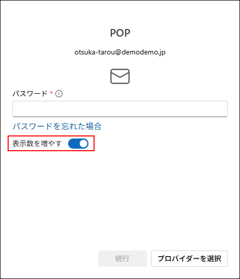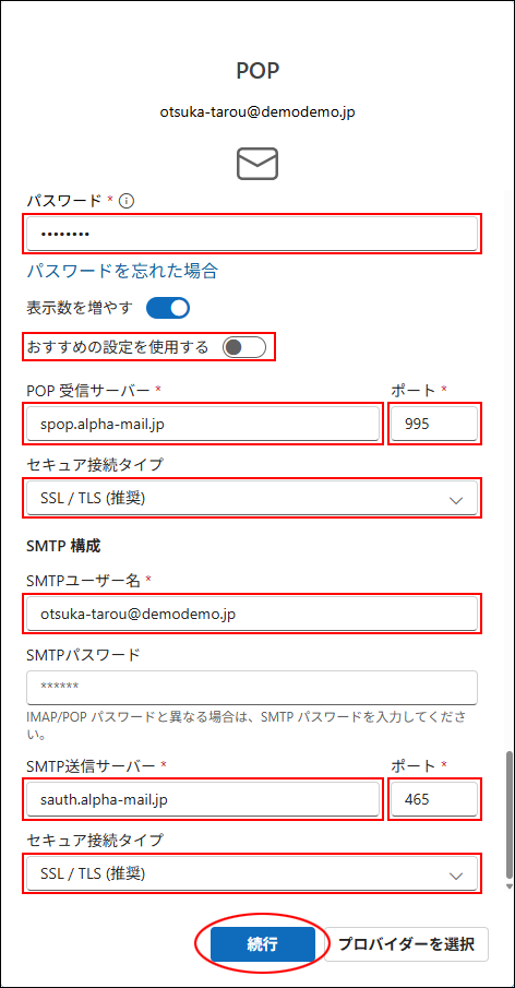 おすすめの設定を使用する 「オフ」を選択 POP受信サーバー 「spop.alpha-mail.jp」を入力 -