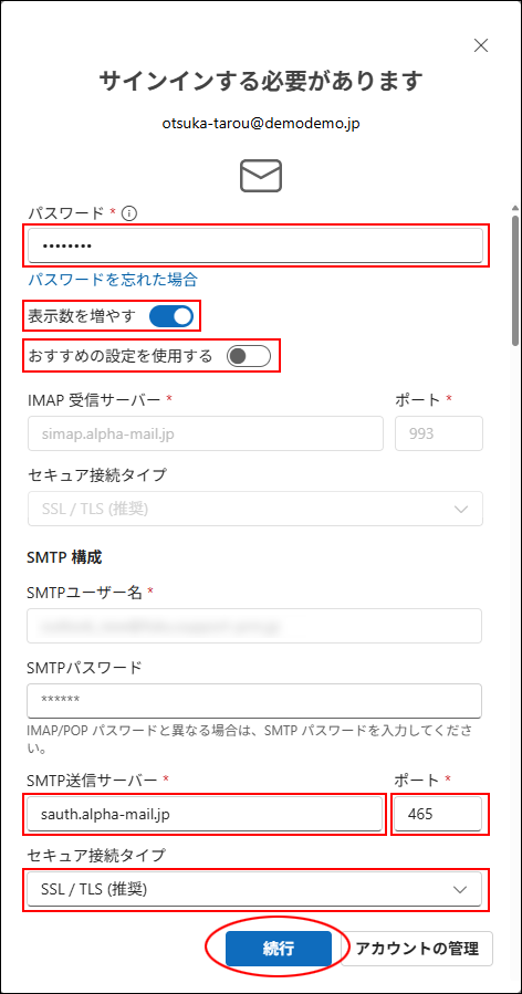 表示数を増やす 「オン」を選択 おすすめの設定を使用する 「オフ」を選択 SMTP構成 SMTP送信サーバー 「sauth.alpha-mail.jp」を入力 -